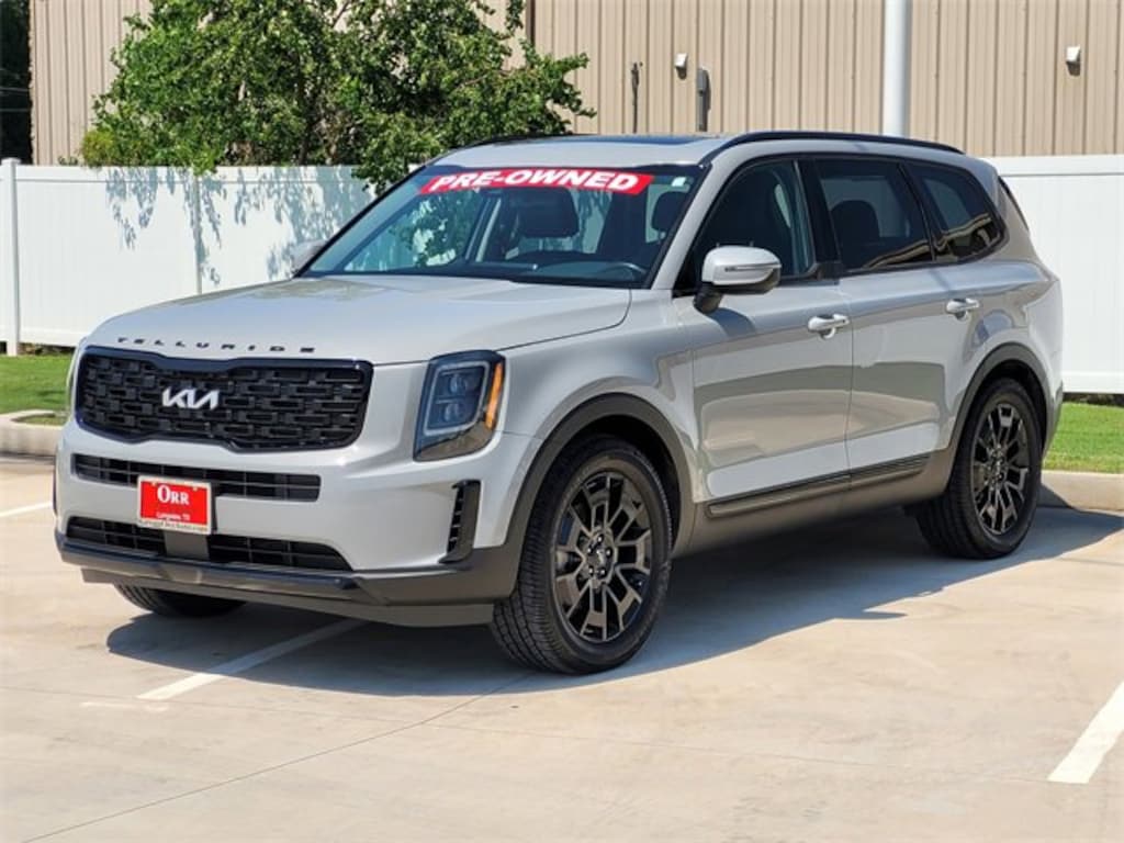 This 2022 Kia Telluride comes equipped with EX Premium Package (20 x 7.5 Machined Alloy Wheels, 2nd Row Captain Chairs, LED Headlamps, and Satin Chrome Roof Rails), Nightfall Edition Package (Black Finish Radiator Grille, Exclusive Black Headlight Bezels, Front & Rear Gloss Black Finish Bumper Skid Plates, Gloss Black Finish Exterior Emblems, Gloss Black Finish Front & Rear Door Garnish, Gloss Black Finish Roof Rails, and Wheels: 20 x 7.5 Exclusive Black Alloy), Towing Package (Self Leveling Rear Suspension and Tow Hitch w/Harness (TOF)), Navigation System, 3.648 Axle Ratio, 3rd row seats: split-bench, 4-Wheel Disc Brakes, 6 Speakers, ABS brakes, Air Conditioning, Alloy wheels, AM/FM radio: SiriusXM, Apple CarPlay & Android Auto, Auto-dimming Rear-View mirror, Automatic temperature control, Brake assist, Bumpers: body-color, Carpeted Floor Mats, Compass, Delay-off headlights, Driver door bin, Driver vanity mirror, Dual front impact airbags, Dual front side impact airbags, Electronic Stability Control, Emergency communication system: 911 Connect, Four wheel independent suspension, Front anti-roll bar, Front Bucket Seats, Front Center Armrest, Front dual zone A/C, Front reading lights, Fully automatic headlights, Heated & Ventilated Front Bucket Seats, Heated door mirrors, Heated front seats, Heated steering wheel, Illuminated entry, Knee airbag, Leather Seat Trim, Leather Shift Knob, Leather steering wheel, Low tire pressure warning, Occupant sensing airbag, Outside temperature display, Overhead airbag, Overhead console, Panic alarm, Passenger door bin, Passenger vanity mirror, Power door mirrors, Power driver seat, Power Liftgate, Power moonroof, Power passenger seat, Power steering, Power windows, Radio data system, Radio: AM/FM Display Audio System, Rear air conditioning, Rear anti-roll bar, Rear audio controls, Rear reading lights, Rear seat center armrest, Rear window defroster, Rear window wiper, Reclining 3rd row seat, Remote keyless entry, Roof rack: rails only, Security system, Smart Key w/ Push Button and Remote Start, Speed control, Speed-sensing steering, Split folding rear seat, Spoiler, Steering wheel mounted audio controls, Tachometer, Telescoping steering wheel, Tilt steering wheel, Traction control, Trip computer, Turn signal indicator mirrors, Variably intermittent wipers, Ventilated front seats, and Wheels: 18 x 7.5 Machined Alloy. CARFAX One-Owner. 20 x 7.5 Machined Alloy Wheels, 2nd Row Captain Chairs, Black Finish Radiator Grille, EX Premium Package, Exclusive Black Headlight Bezels, Front & Rear Gloss Black Finish Bumper Skid Plates, Gloss Black Finish Exterior Emblems, Gloss Black Finish Front & Rear Door Garnish, Gloss Black Finish Roof Rails, LED Headlamps, Navigation System, Nightfall Edition Package, Satin Chrome Roof Rails, Self Leveling Rear Suspension, Tow Hitch w/Harness (TOF), Towing Package, Wheels: 20 x 7.5 Exclusive Black Alloy.